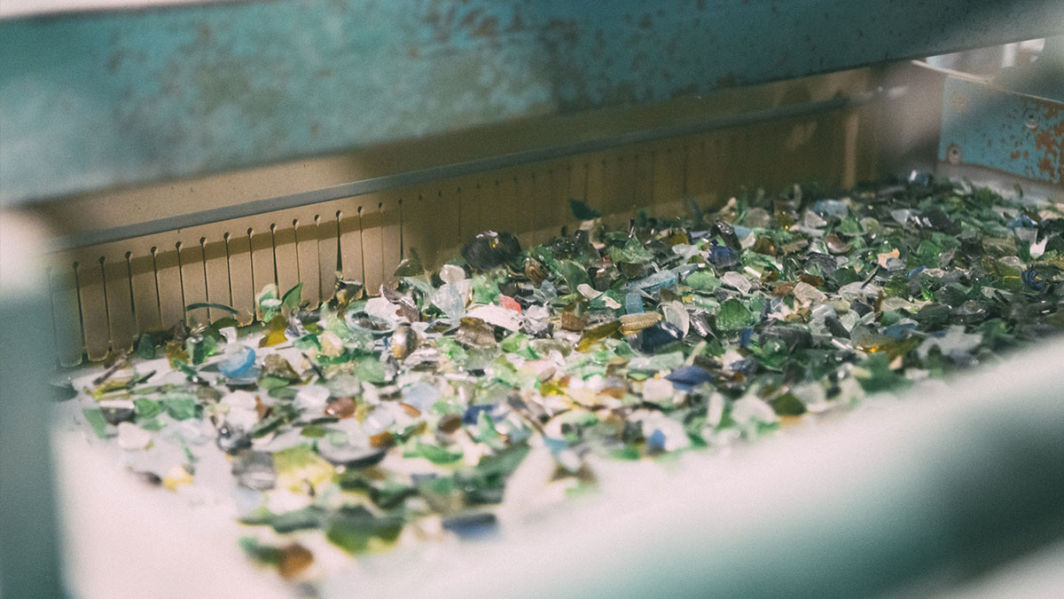 この施設では主に集められたワンウェイびん(茶・白・その他)を破砕し、ラベル・アルミキャップ、その他の異物を除去してカレットと呼ばれガラスびん製造の材料を生産しています。
